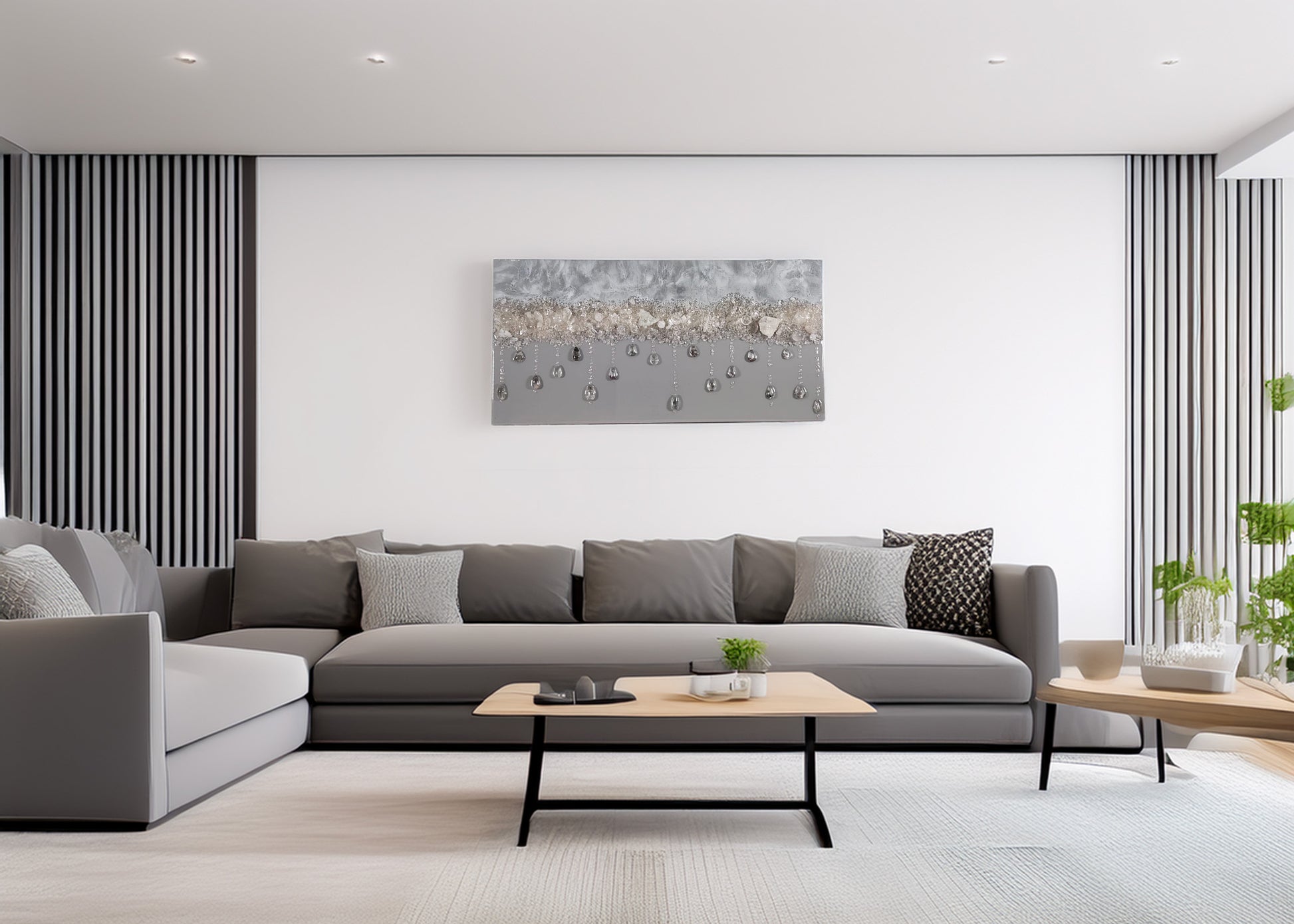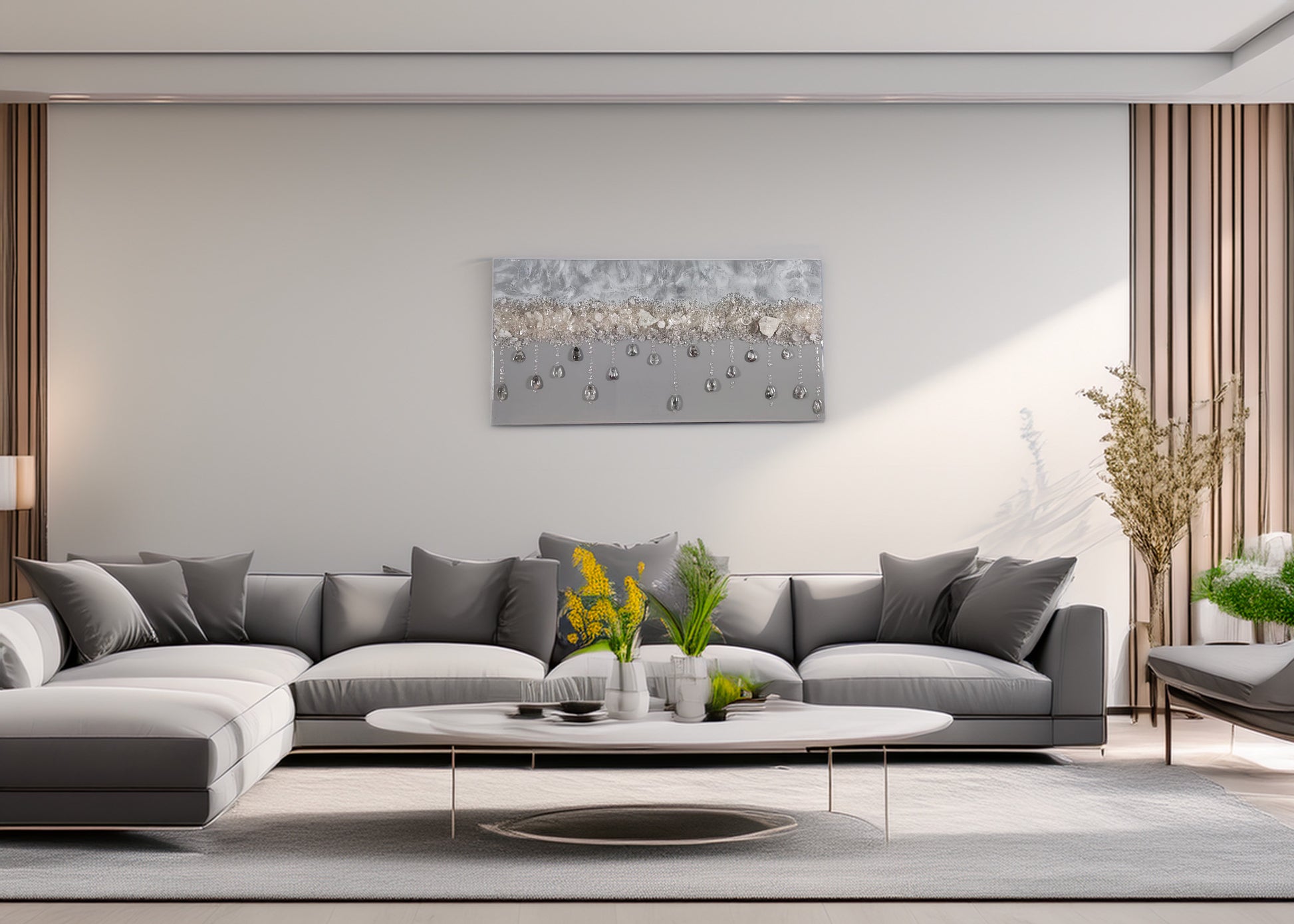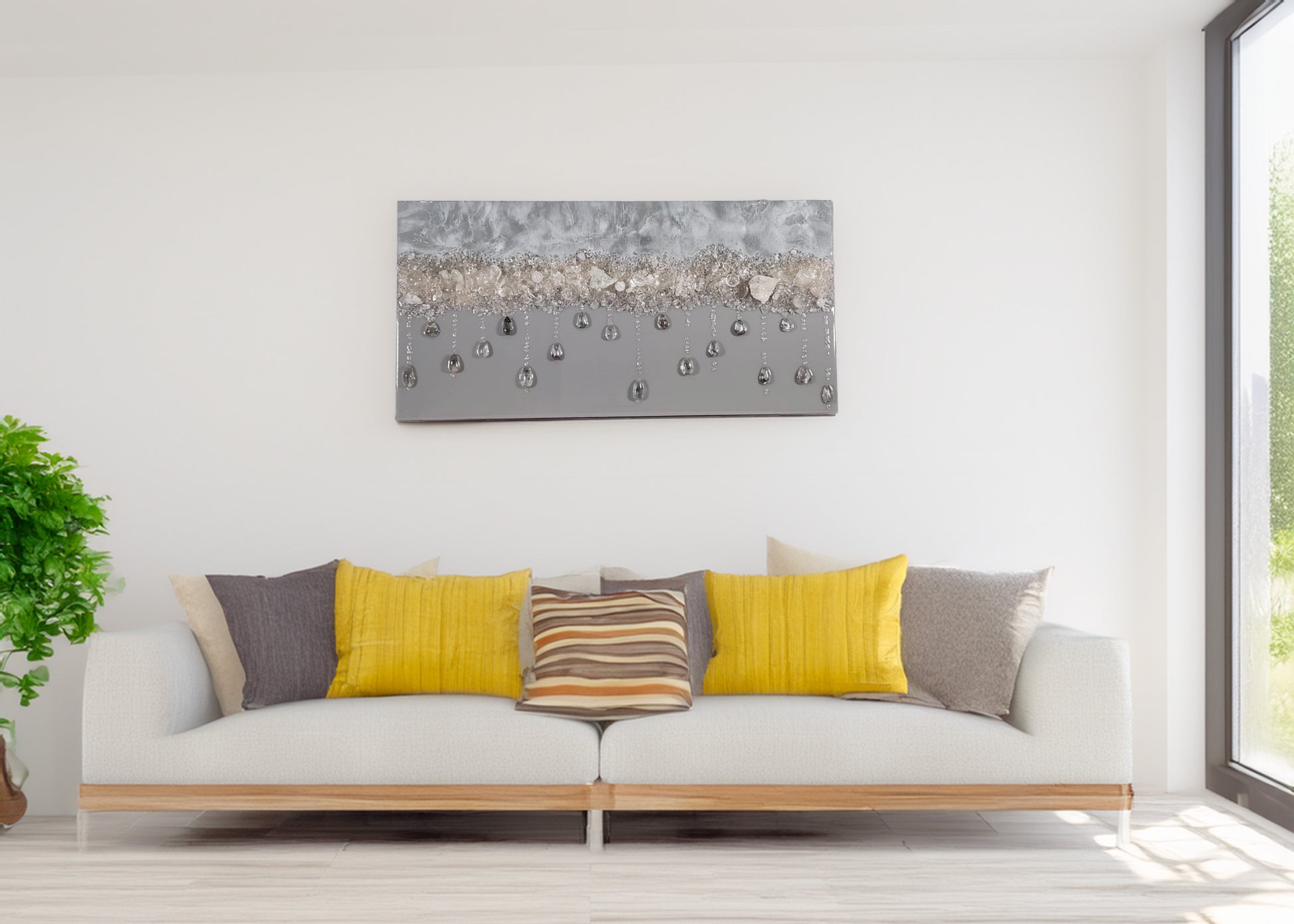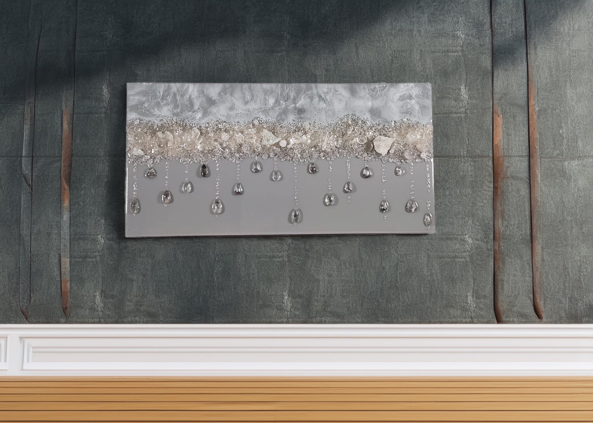 Discover a sparkling oasis in your home with Crystal Rainfall. Handmade with high-quality resin and authentic crystals, this wall art showcases the beauty of rain with clear quartz chips, clusters, spheres, and tumbles. The diamond coat ensures longevity and shine, while the MDF board provides a sturdy base. For safety, professional installation is recommended and gloves are advised for handling the sharp crystals. Dimensions: 40 cm by 60cm.