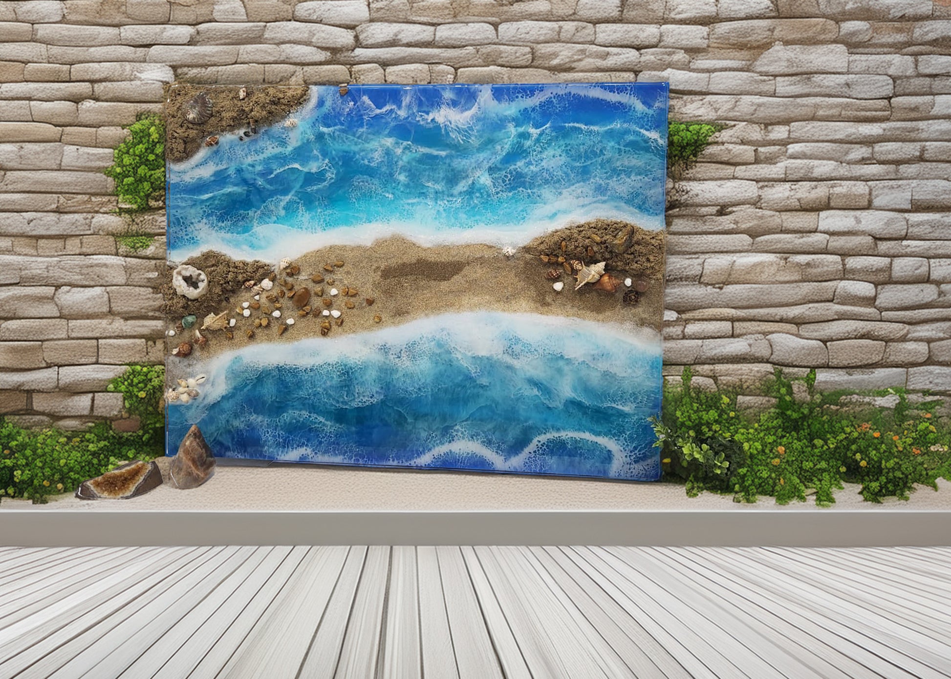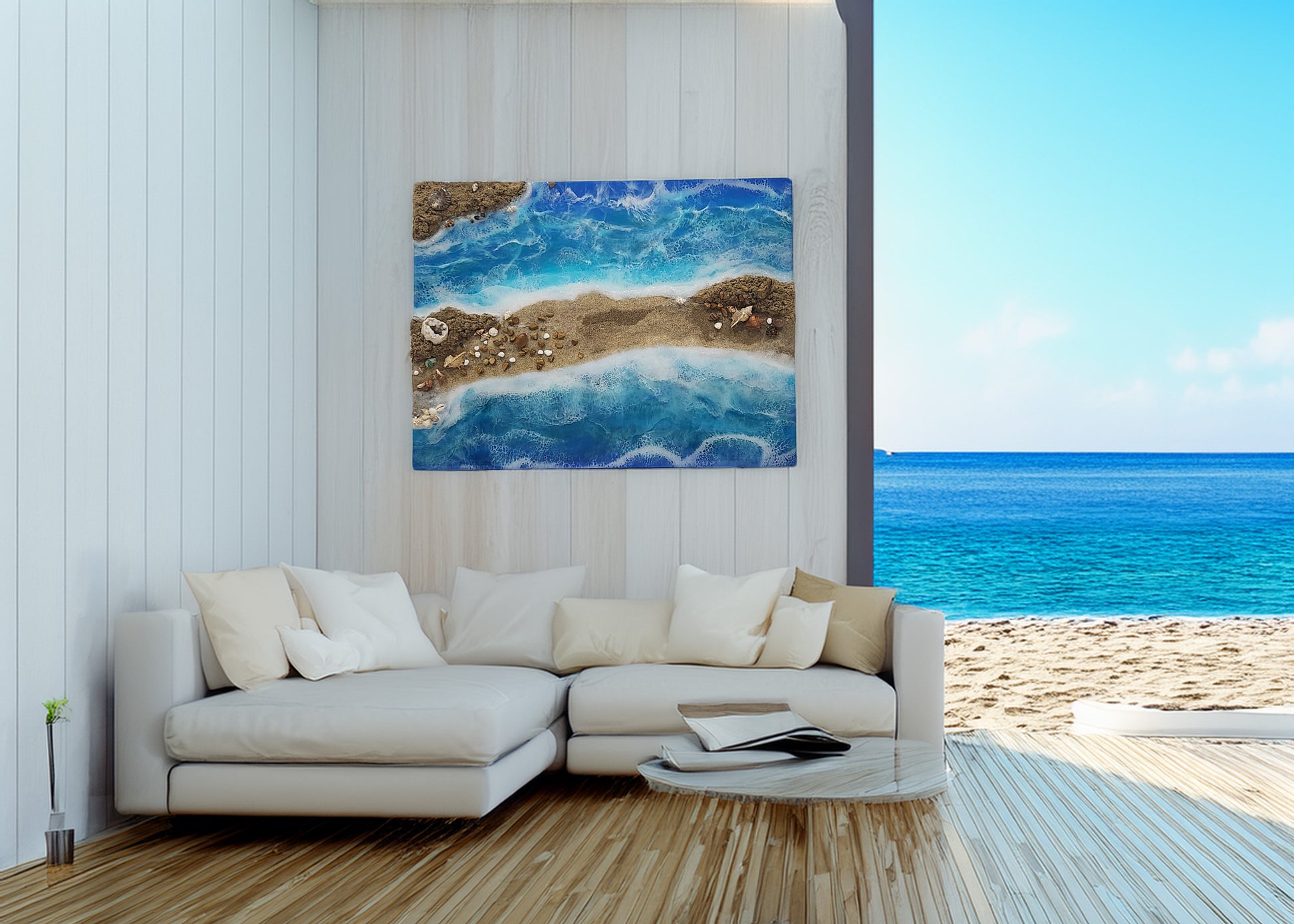 Introducing Kiama Coast, the stunning resin wall art inspired by the beautiful Australian coast. Made with real crystals such as Ammolite, Ammonites, and raw Agate, this piece features a wave effect created by multiple layers of resin. Including real sand from Kiama coast and sea shells this wall art is a perfect addition to any home. Please note that it does not come with hooks for safety purposes, so we recommend professional installation.